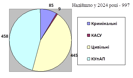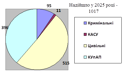 Протягом 2025 року до суду надійшло 1017 справ та матеріалів різних категорій , що більше на 20 ( або 2,0 %) проти 997 справ та матеріалів різних категорій у 2024 році: