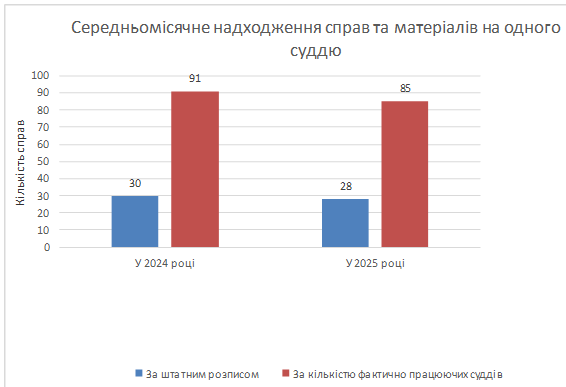 Середньомісячне надходження справ та матеріалів на одного суддю за штатним розписом у 2025 році склало 28 справ, а за кількістю фактично працюючих суддів – 85 справ , оскільки правосуддя здійснює один суддя, дві посади судді вакантні .