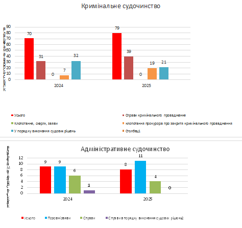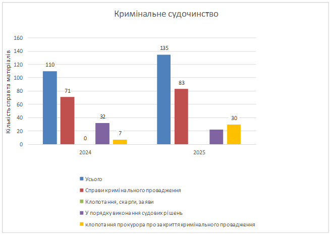 У 2025 році судом було розглянуто 79 справ та матеріалів кримінального судочинства, що у відсотковому співвідношенні склало 58,5 % загальної кількості справ та матеріалів, які перебували в провадженні суду, у тому числі задоволено 40, що складає 29,6% загальної кількості справ та матеріалів кримінального судочинства.