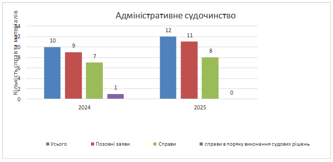 У 2025 році залишок нерозглянутих справ та матеріалів адміністративного судочинства склав 4 справи , аналогічний період 2024 року - 1 справа. Порушень строків призначення справ не було, 1 справа розглянута понад строки.