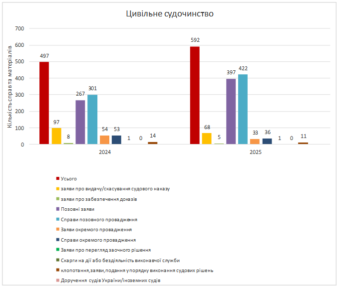 Протягом 2025 року в провадженні суду перебувало 1140 справ та матеріалів різних категорій , що на 46 справ ( або 4,2 %) більше, ніж у 2024 році: